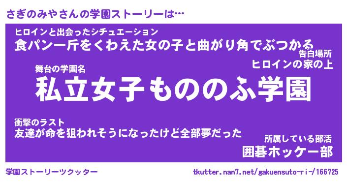 | ヒーロー風カッコイイあだ名 | 『スーパーサギノミヤ』『暗黒騎士サギ』 |