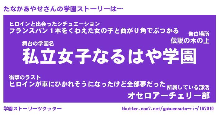 | ヒーロー風カッコイイあだ名 | 『スーパータナカアヤセ』『天弓騎士タナ』 |