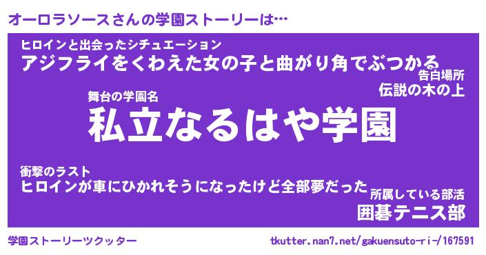 | 女子向けラノベタイトル風あだ名 | 『(仮)オーロラソースのやんごとなき事情』 |