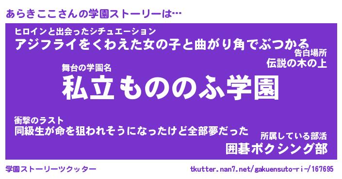 | 男性向けラノベタイトル風あだ名 | 『あらきここの憂鬱』 |