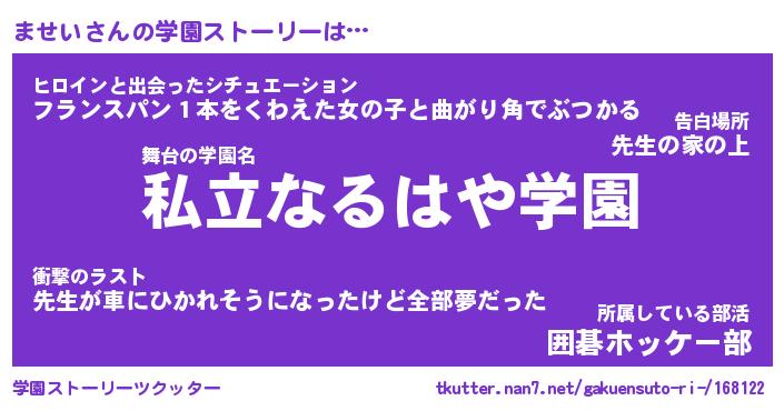 | 告白場所 先生の家の上 …「ふぃぎゅこ」 | 2月17日 06:24 |