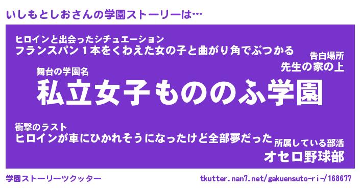 | ヒーロー風カッコイイあだ名 | 『スーパーイシモトシオ』『炎刃騎士イシ』 |