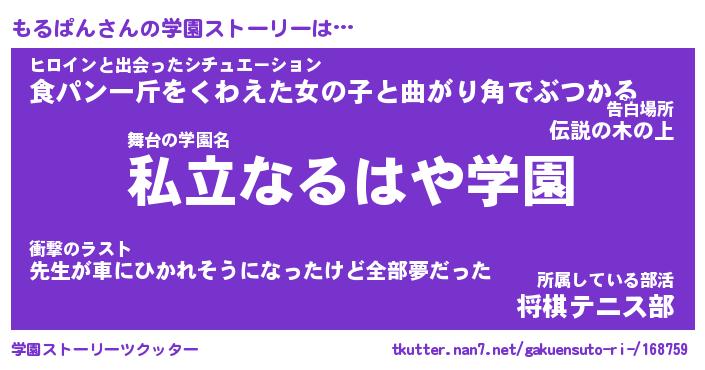 | 女子向けラノベタイトル風あだ名 | 『(仮)もるぱんのやんごとなき事情』 |
