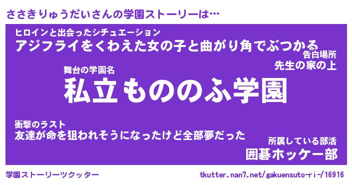 | 女子向けラノベタイトル風あだ名 | 『(仮)ささきりゅうだいのやんごとなき事情』 |