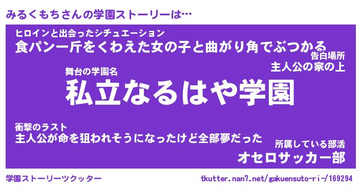 | 伝説のあだ名 | 『伝説のスナイパーみるくもち』 |
