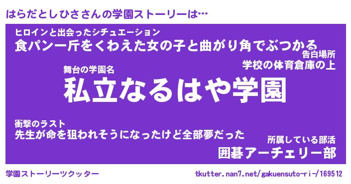 | 女子向けラノベタイトル風あだ名 | 『(仮)はらだとしひさのやんごとなき事情』 |