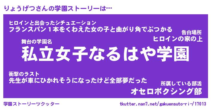 | ファンタジー風あだ名 | 『リョフェル』『エターナルリョウゲツー』 |