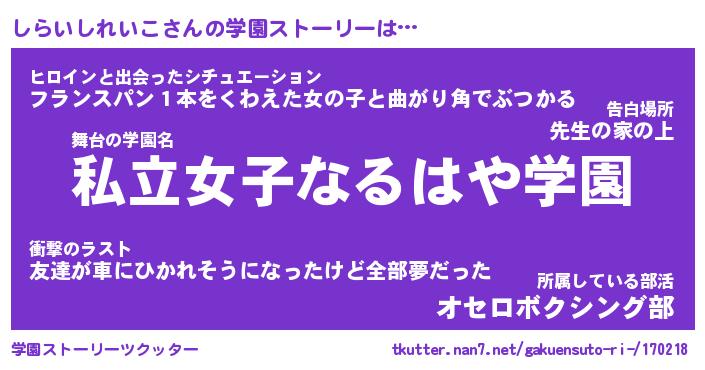| 男性向けラノベタイトル風あだ名 | 『シライシレイコアートオンライン』 |