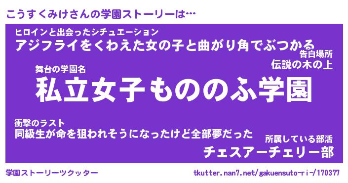 | 女子向けラノベタイトル風あだ名 | 『こうすくみけ姫と円卓の騎士』 |