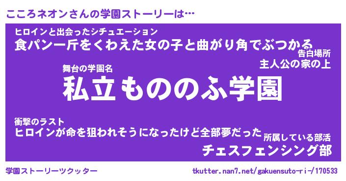 | 女子向けラノベタイトル風あだ名 | 『(仮)こころネオンのやんごとなき事情』 |