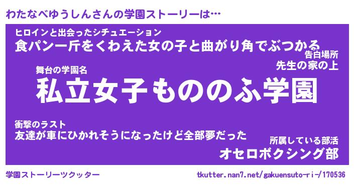 | 女子向けラノベタイトル風あだ名 | 『わたなべゆうしん姫と円卓の騎士』 |