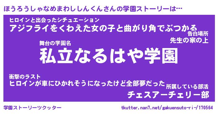 | 男性向けラノベタイトル風あだ名 | 『ほうろうしゃなめまわししんくんの憂鬱』 |