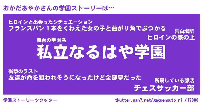 | 女子向けラノベタイトル風あだ名 | 『(仮)おかだあやかのやんごとなき事情』 |
