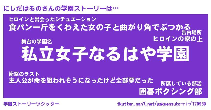 | 女子向けラノベタイトル風あだ名 | 『誰かこのにしだはるのを説明してください! ~契約から始まるウェディング~』 |