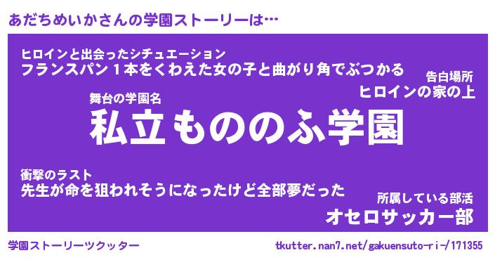 | 女子向けラノベタイトル風あだ名 | 『(仮)あだちめいかのやんごとなき事情』 |