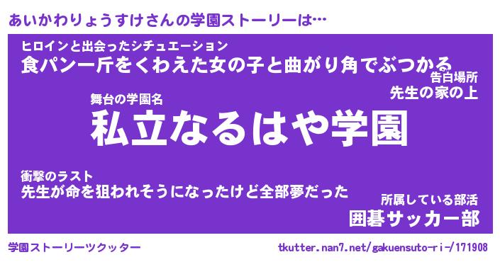 | 女子向けラノベタイトル風あだ名 | 『(仮)あいかわりょうすけのやんごとなき事情』 |