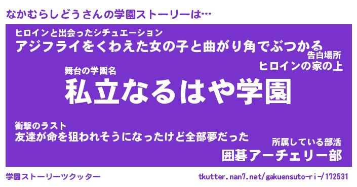 | 男性向けラノベタイトル風あだ名 | 『なかむらしどうの憂鬱』 |