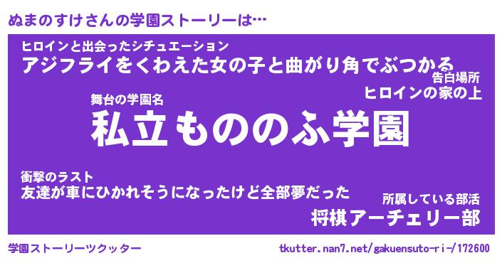 | 女子向けラノベタイトル風あだ名 | 『(仮)ぬまのすけのやんごとなき事情』 |