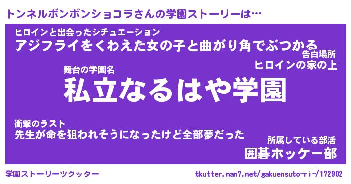 | 女子向けラノベタイトル風あだ名 | 『(仮)トンネルボンボンショコラのやんごとなき事情』 |