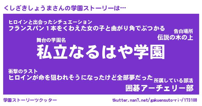| 男性向けラノベタイトル風あだ名 | 『くしざきしょうまの憂鬱』 |