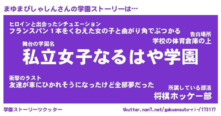 | 女子向けラノベタイトル風あだ名 | 『まゆまぴしゃしん姫と円卓の騎士』 |