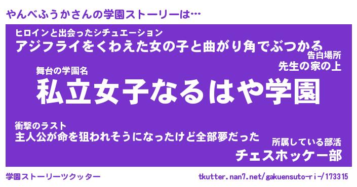 | 女子向けラノベタイトル風あだ名 | 『やんべふうか姫と円卓の騎士』 |