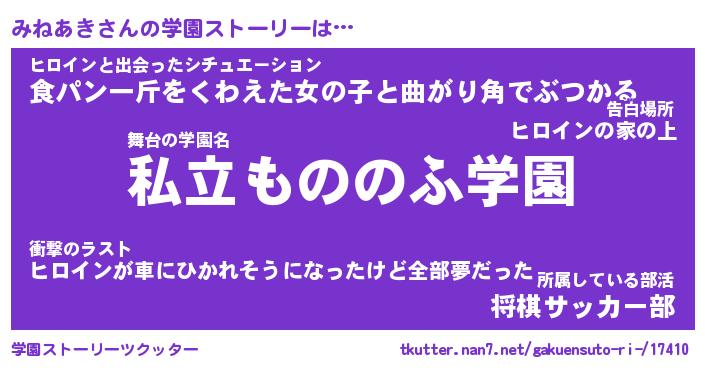 | 男性向けラノベタイトル風あだ名 | 『みねあきの憂鬱』 |