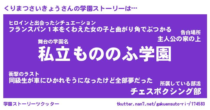 | 男性向けラノベタイトル風あだ名 | 『くりまつさいきょうの憂鬱』 |