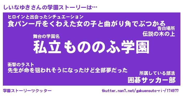 | 女子向けラノベタイトル風あだ名 | 『(仮)しいなゆきのやんごとなき事情』 |