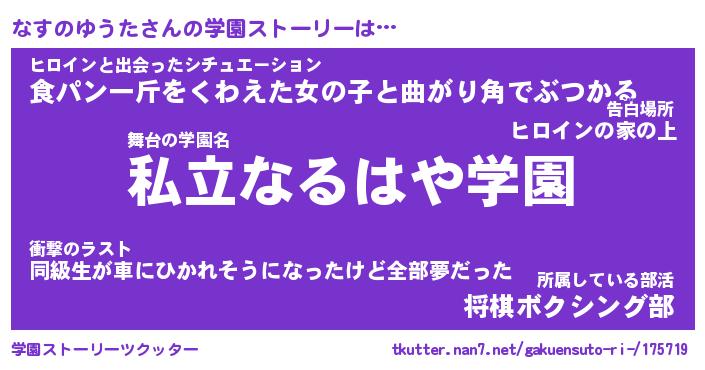 | ヒーロー風カッコイイあだ名 | 『スーパーナスノユウタ』『銀牙騎士ナス』 |