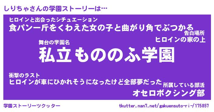 | 男性向けラノベタイトル風あだ名 | 『しりちゃの憂鬱』 |