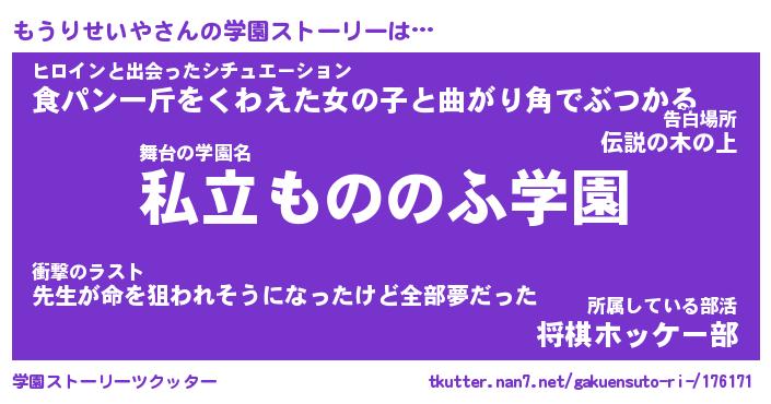 | 女子向けラノベタイトル風あだ名 | 『(仮)もうりせいやのやんごとなき事情』 |