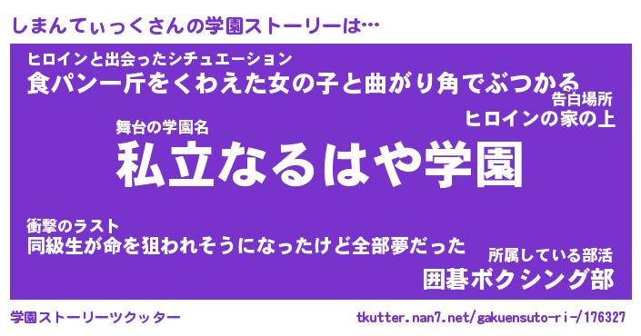 | 男性向けラノベタイトル風あだ名 | 『しまんてぃっくの憂鬱』 |