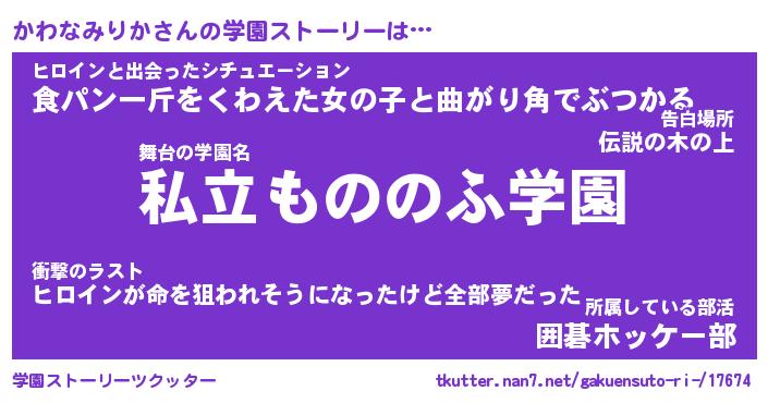 | 女子向けラノベタイトル風あだ名 | 『かわなみりか姫と円卓の騎士』 |