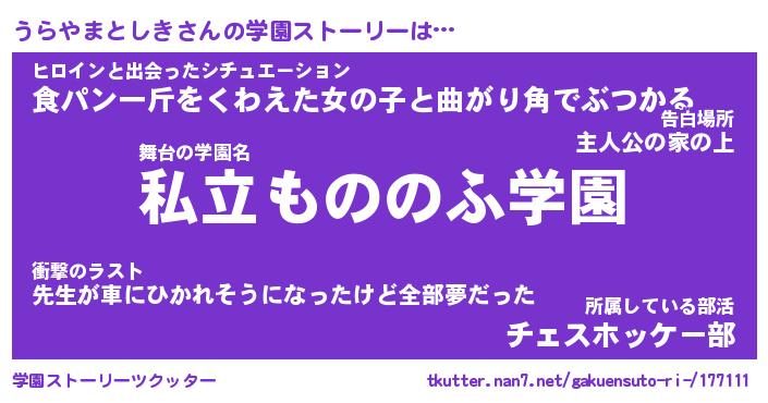 | 男性向けラノベタイトル風あだ名 | 『うらやまとしきの憂鬱』 |