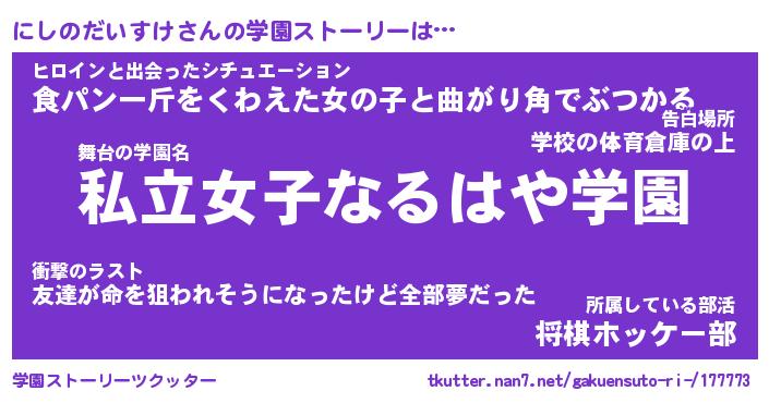 | 女子向けラノベタイトル風あだ名 | 『誰かこのにしのだいすけを説明してください! ~契約から始まるウェディング~』 |