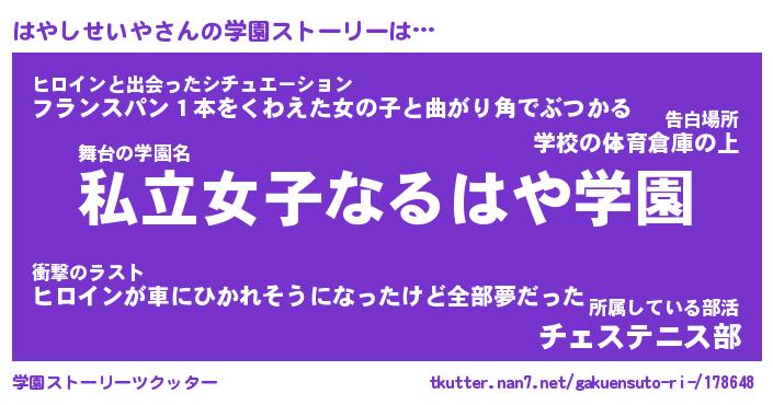 | ヒーロー風カッコイイあだ名 | 『スーパーハヤシセイヤ』『天弓騎士ハヤ』 |