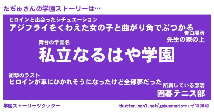 | 女子向けラノベタイトル風あだ名 | 『(仮)たぢゅのやんごとなき事情』 |
