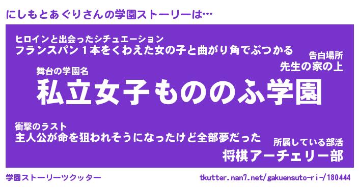 | 女子向けラノベタイトル風あだ名 | 『誰かこのにしもとあぐりを説明してください! ~契約から始まるウェディング~』 |