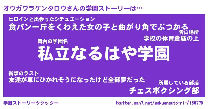 | 男性向けラノベタイトル風あだ名 | 『オウガワラケンタロウの憂鬱』 |