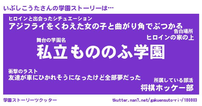 | 女子向けラノベタイトル風あだ名 | 『(仮)いぶしこうたのやんごとなき事情』 |