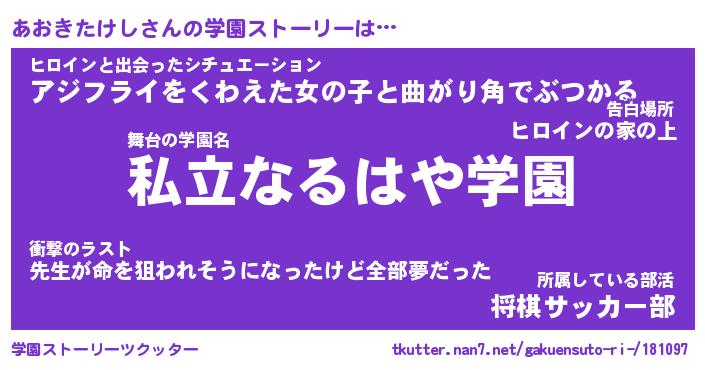 | 伝説のあだ名 | 『不死鳥のスナイパーあおきたけし』 |