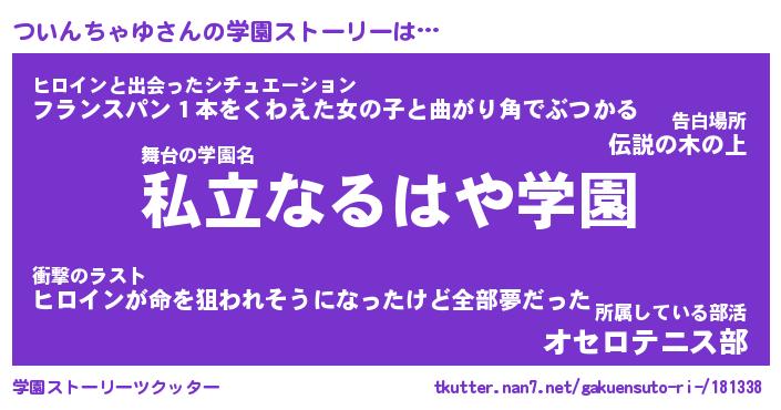 | 男性向けラノベタイトル風あだ名 | 『ついんちゃゆの憂鬱』 |