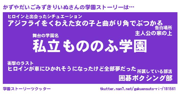 | 女子向けラノベタイトル風あだ名 | 『(仮)かずやだいごみずきりいぬのやんごとなき事情』 |
