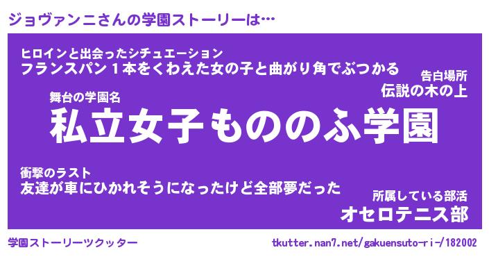 | 女子向けラノベタイトル風あだ名 | 『誰かこのジョヴァンニを説明してください! ~契約から始まるウェディング~』 |