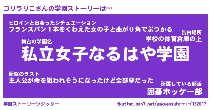 | 男性向けラノベタイトル風あだ名 | 『ゴリラリコアートオンライン』 |