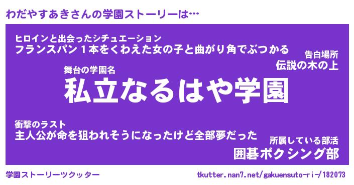 | 男性向けラノベタイトル風あだ名 | 『わだやすあきの憂鬱』 |