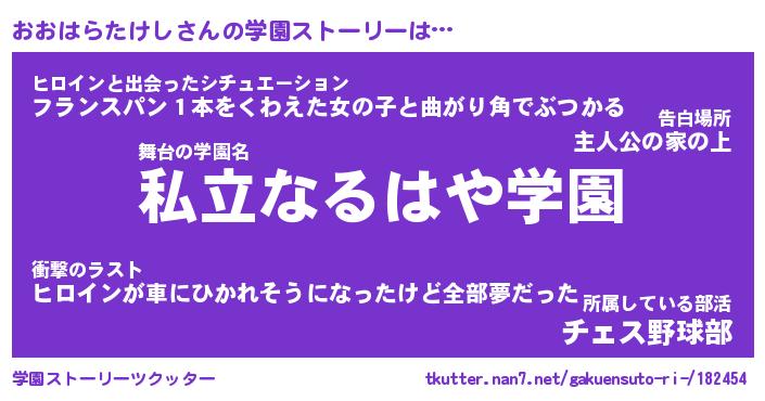 | 女子向けラノベタイトル風あだ名 | 『(仮)おおはらたけしのやんごとなき事情』 |