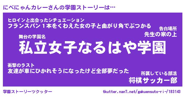 | 伝説のあだ名 | 『封印されしスナイパーにべにゃんカレー』 |