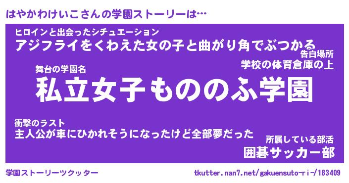 | 女子向けラノベタイトル風あだ名 | 『はやかわけいこ姫と円卓の騎士』 |
